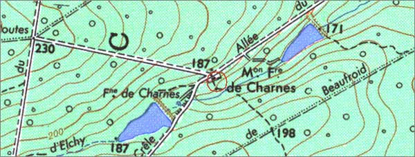 Commentaire historique: Le site de Charnes est occupé dès l'époque celtique. Etienne, premier comte de Sancerre, fait don du bois de Charnes à quelques moines de l'ordre de Grandmont en 1167 ; les moines y fondent un prieuré (fondation confirmée par l'abbé de Saint-Satur en 1173). Les vestiges de ce prieuré du 12e siècle (église et deux bâtiments perpendiculaires d'après la description de Buhot de Kersers vers 1880) sont situés en contrebas de la maison forestière actuelle. Pillés par les anglais en 1421, les bâtiments du prieuré resteront à l'état de ruines : en 1504, dans les archives du comté de Sancerre, le prieuré est "en ruine et friche"… Un projet de reconstruction est rédigé au début du 17e siècle, mais ne sera jamais réalisé ; seule une chapelle est construite (fin du 17e siècle). Vendue à la Révolution, elle sera transformée en habitation en 1882 : quelques éléments (croix en pignon) indiquent son affectation d'origine.