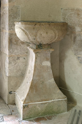 Bénitier ovale sur pied en forme de balustre de facture classique.