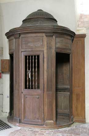 Modèle de confessionnal utilisant les motifs décoratifs de la fin du 18e siècle : forme semi-circulaire, dôme, pilastres cannelés.