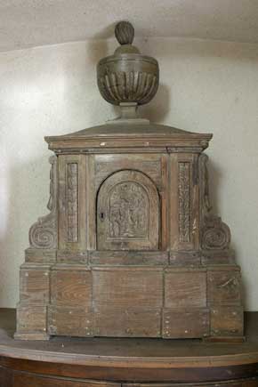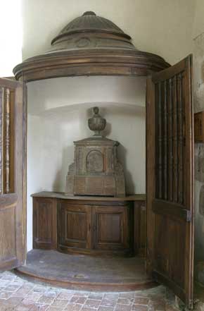 Meuble destiné à enfermer l'armoire aux saintes huiles et les fonts baptismaux. L'armoire aux saintes huiles a ici la forme d'un tabernacle : la porte sculptée représente le baptême du Christ.