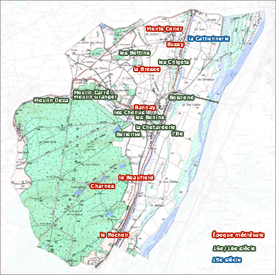 ![]() Chronologie de l'implantation de l'habitat (Agrandir) | ![]() | Chronologie de l'implantation de l'habitat (d'après les premières mentions d'archives et les sources cartographiques consultées) Bussy et Monte Conor, qui parfois se confondent (carte du comté), le bourg de Bannay et les domaines de Rochoir et de Beaufroid sont les lieux habités les plus anciens (à partir du 13e siècle). Faute de documents d'archives sur la plupart des lieux-dits, l'habitat est surtout attesté grâce aux cartes (plan du comté de Sancerre, 17e siècle, carte de Cassini, 18e siècle). Il n'y a qu'un nouveau site au 19e siècle, en revanche certains lieux-dits se sont densifiés, particulièrement le long de la nouvelle route départementale et aux Fouchards, limitrophe de la commune de Boulleret. |