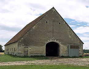 | Les fermes isolées au cur de vastes domaines sont très peu nombreuses car la petite exploitation agricole dominait sur Couargues. Ces fermes, regroupant autour d'une cour bâtiments d'exploitation et habitation (type " ferme à cour ouverte"), ont conservé pour deux d'entre elles une grange dont la silhouette est typique des granges du Sancerrois. Ces granges, servant également d'étables avec une division tripartite de leur espace intérieur, se distinguent par d'impressionnantes charpentes sur poteaux. Leur entrée est en pignon par une porte charretière couverte d'un arc plein cintre ou segmentaire (1). Ces bâtiments méritent d'être conservés. |