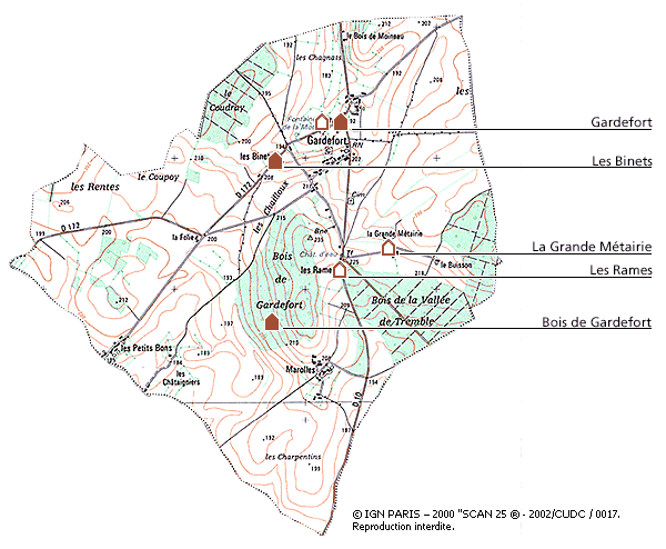 Renvoie à une fiche d'édifices sélectionnés (carte IGN, plan cadastral, texte et photographies). Dans Gardefort : accès aux dossiers sélectionnés par le plan cadastral du dossier "Village".