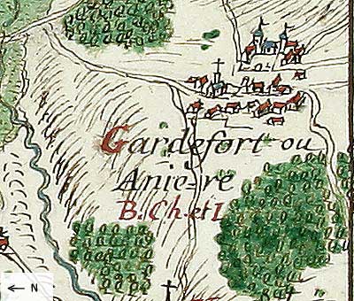 Ce plan, a été dessiné par Nicolas Lallemant, dans les années 1670, pour le prince de Condé, comte de Sancerre. La paroisse encore nommée « Gardefort ou Asnière » présente un habitat relativement peu dense, regroupé dans le bourg et dans le hameau de Marolle au sud. Le château de Gardefort est curieusement situé nettement à l'est du bourg alors que les quelques vestiges conservés l'indiquent aux abords immédiats de l'église. Il est décrit avec précision dans lAveu et dénombrement de la seigneurie par Esme Gressin en 1679 : « maison seigneuriale de Gardefort, proche léglise dudit lieu, qui consiste en un grand corps de logis,( ), boullangerye, jardin, grange, escurye, pressouer à faire vin, collombier à pied, bergerye, une grande cour, grenier, cave, le tout couvert de tuille et aissil et une tournelle couverte dardoises servant descallier le tout clos et fermés de murailles contenant deux arpents ou environ » |