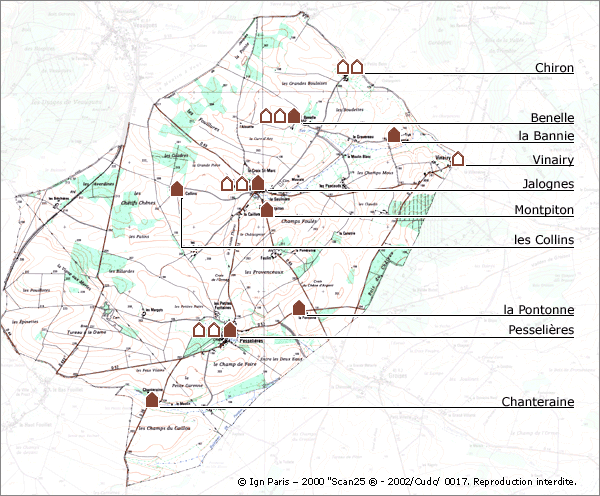 Cliquer sur cette icône renvoie à une ou plusieurs fiches d'édifices sélectionnés (carte IGN, plan cadastral, texte et photographies). Dans Jalognes et Pesselières : accès aux dossiers sélectionnés par le plan cadastral des dossiers "Village" et Pesselières-village. Sauf mention contraire les cartes et plans sont orientés au nord.