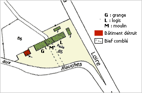 Commentaire historique : attesté en 1487, ce moulin a été reconstruit en 1854 pour le comte de Montalivet, propriétaire du château de la Grange ; ce moulin était encore en fonctionnement en 1911 ; il est actuellement en très mauvais état et le mécanisme a été en grande partie vendu ; le bief a été comblé.
