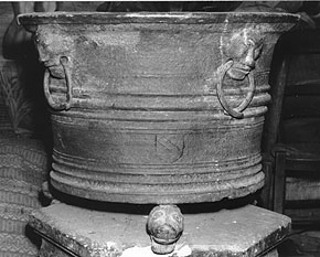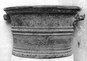 Commentaire historique : Bénitiers issus des ateliers de fonderie en activité dans le quart nord-est du Cher entre le milieu du 15e siècle et le 17e siècle. Sur le bénitier n°2, se trouve un écusson armorié pouvant être, d'après Buhot de Kersers, celui de la famille de la Porte, seigneur de Veaugues.